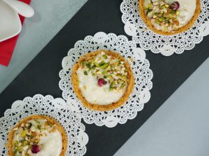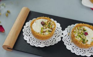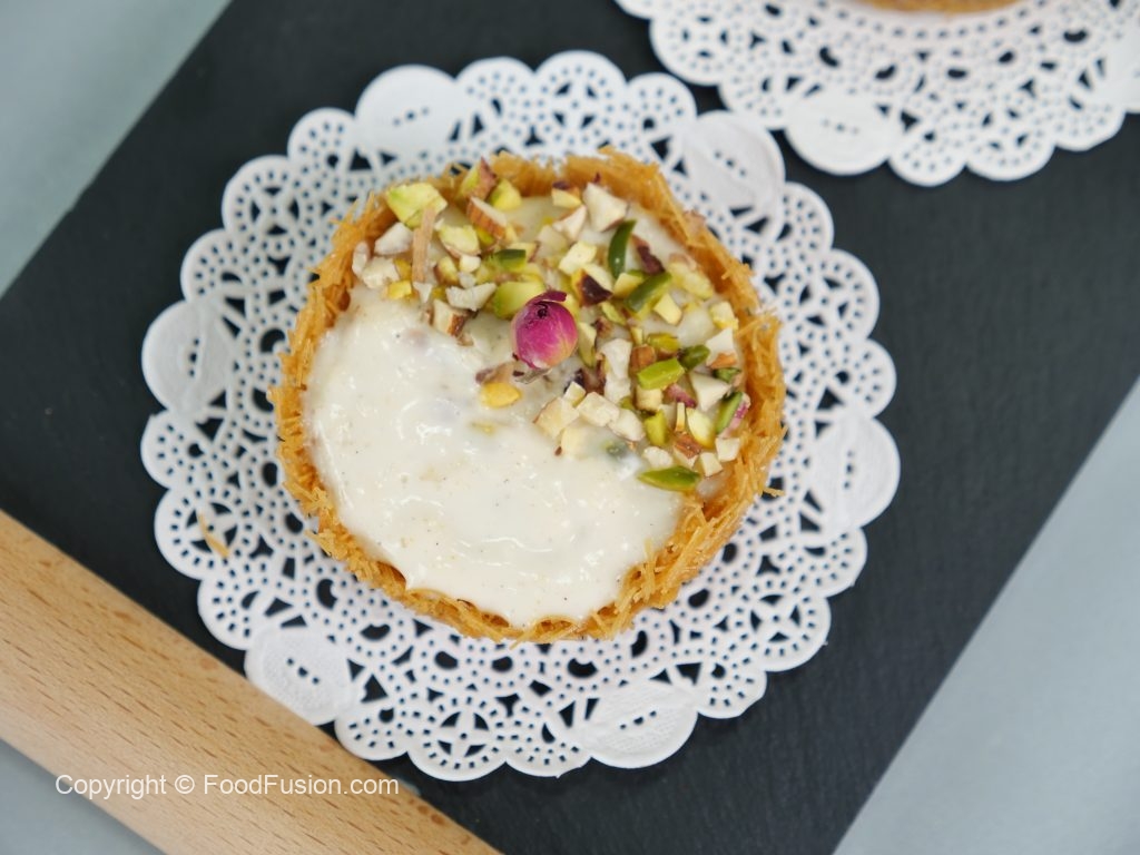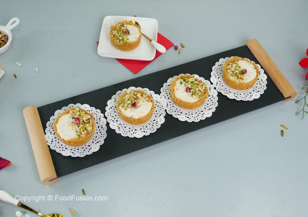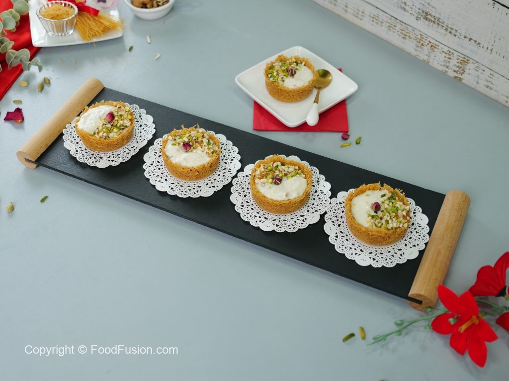 -In a small flat base bowl,place a cling film,add warm vermicelli mixture & press it with the help of wooden pie presser to make a shape of bowl & refrigerate until set (15 minutes) than remove carefully.