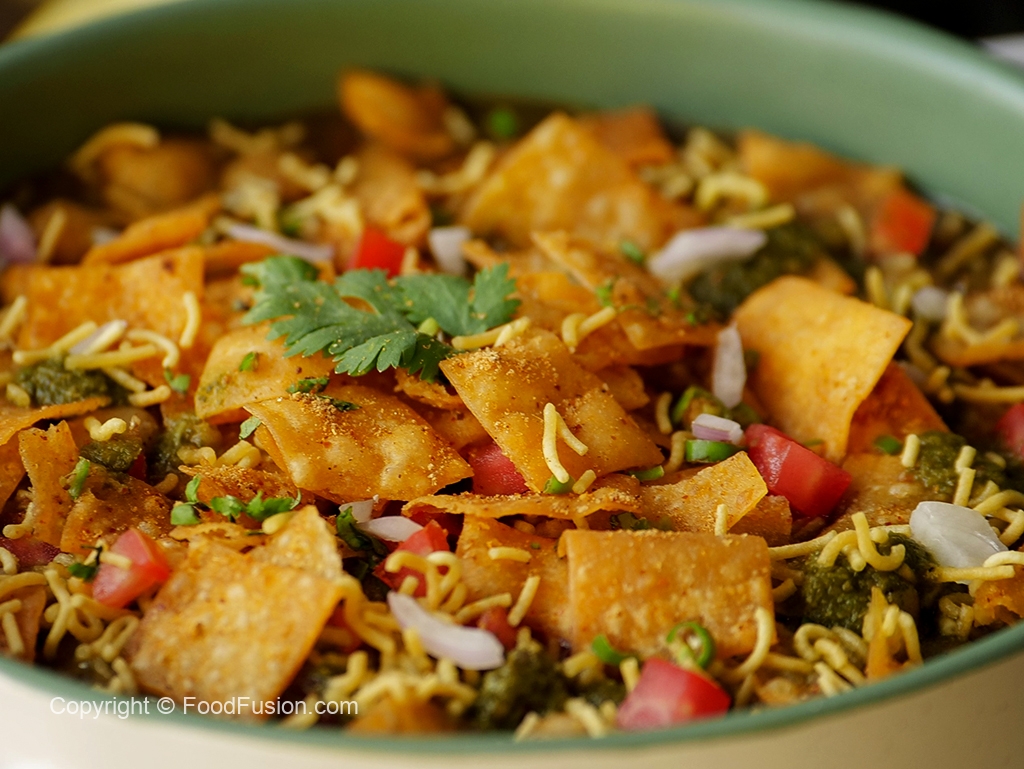 Serving dish mein radga chaat,pyaz,tamatar,hari mirch,spicy green chutney,tamarind sauce,sev nimco,papri,hara dhania aur chaat masala dal ker serve karein!