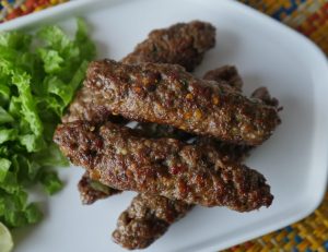 Dip hands in water & take a mixture (55g) and make kababs of equal sizes on skewer (makes 14-15).