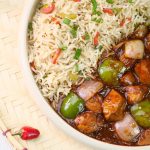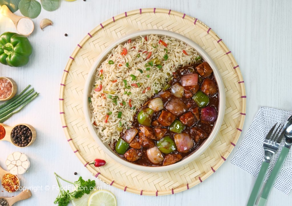 -Spicy Schezwan chicken gravy ko fried rice ka saath serve karein.
