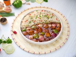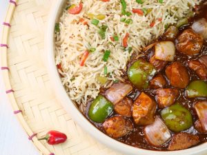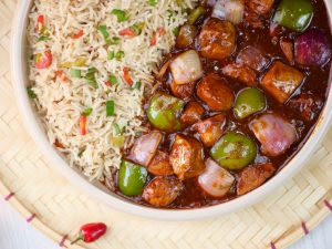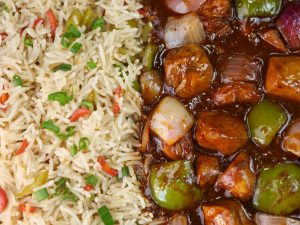 -Serve spicy Schezwan chicken gravy with fried rice!