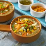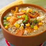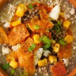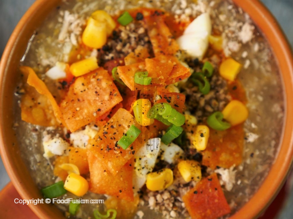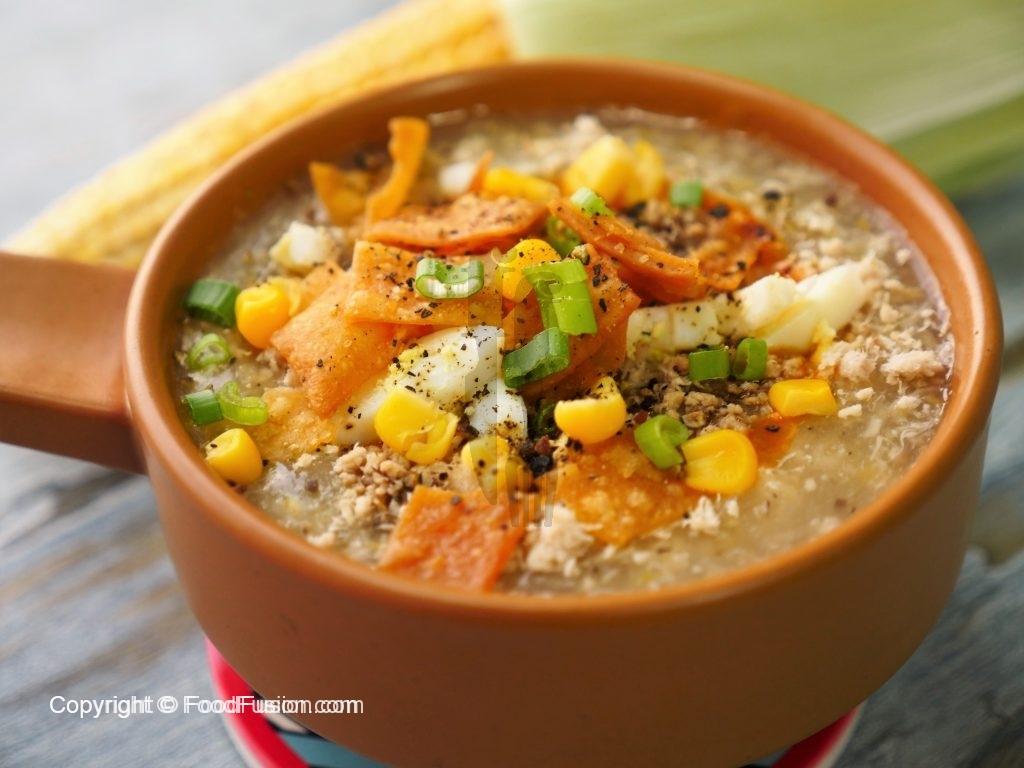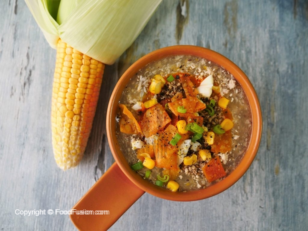 In serving bowl,add chicken corn soup,soy sauce,chili sauce,green chilies in vinegar,shredded chicken, boiled egg,papri,sweet corns,green onion leaves and sprinkle black pepper crushed & serve hot.