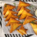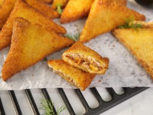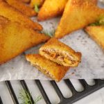 -First, dip samosa in whisked eggs, then coat evenly in bread crumbs.