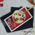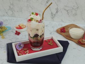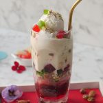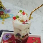 -In a serving glass,add soaked basil seeds,lal sharbat,prepared falooda sawaiyan,mixed nuts,green jelly,red jelly,apple,banana,grapes,pineapple,prepared rabri,vanilla ice-cream,garnish with mixed nuts,,tutti frutti & serve!