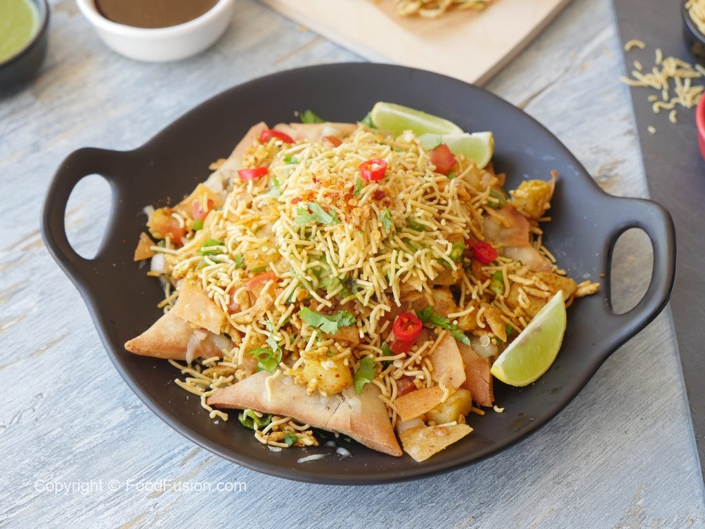 On a serving plate,add chicken samosa and break them with the help of the spoon.
