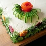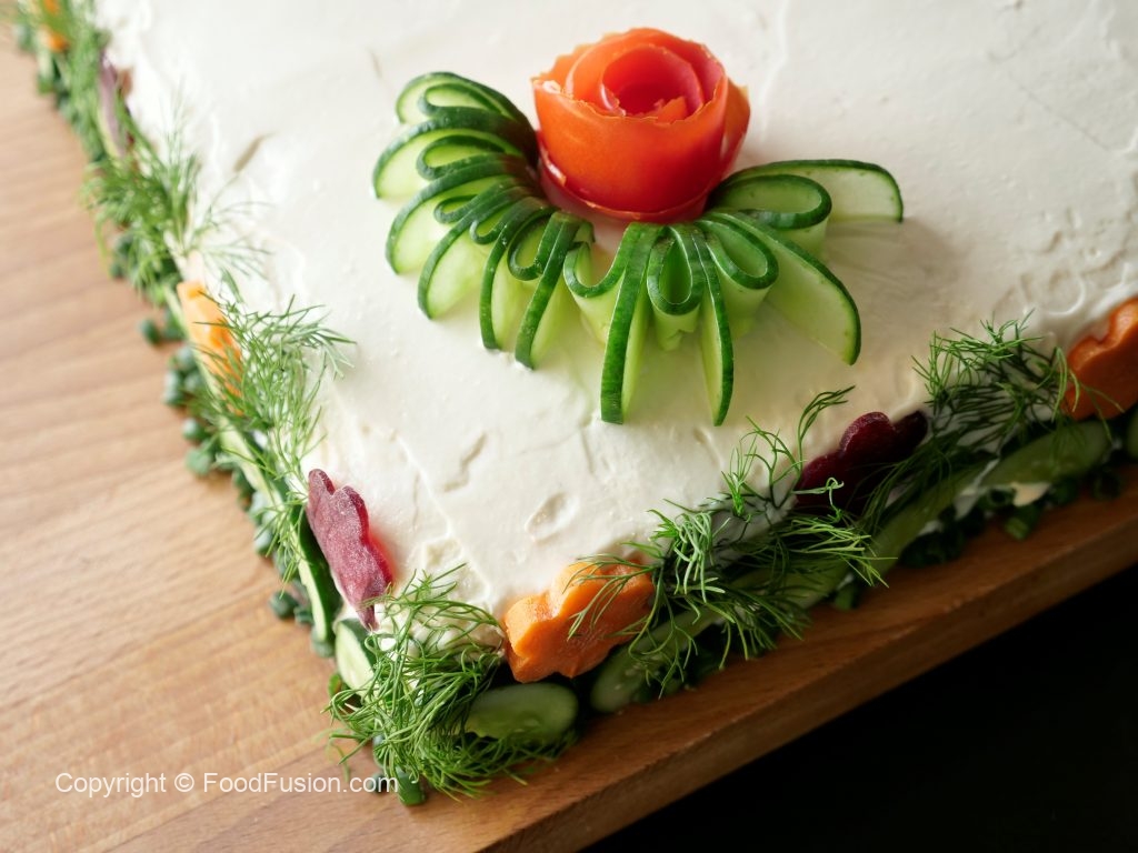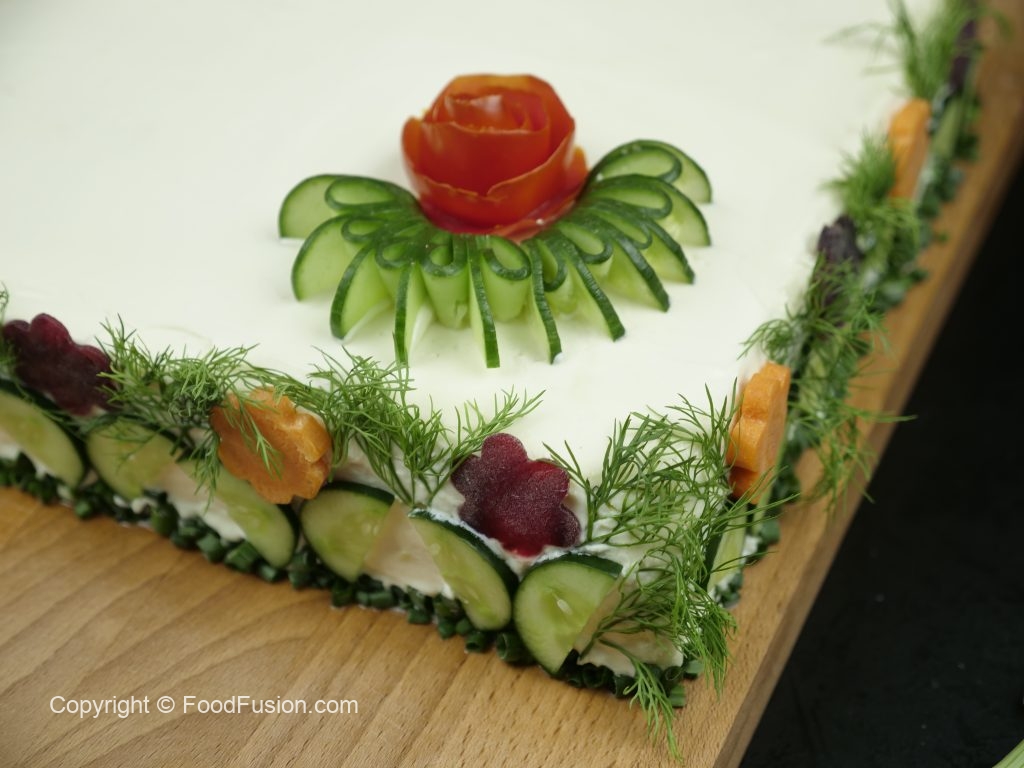 Decorate sides & top with green onion leaves,dill,cucumber,carrot,beetroot & tomato.