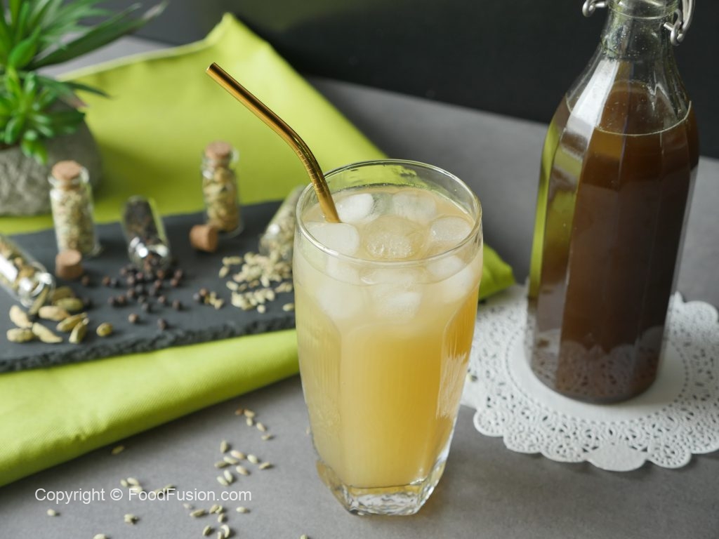 Serving glass mein tayyar saunf ka sharbat aur pai dal ker mix ker lein.