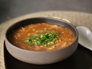 Add prepared chicken stock,carrot,shredded chicken,soy sauce,hot sauce,vinegar,black pepper powder, salt,sugar,tomato ketchup,cabbage,mix well and bring it to boil,cover and cook on low flame for 5-8 minutes.