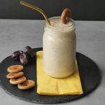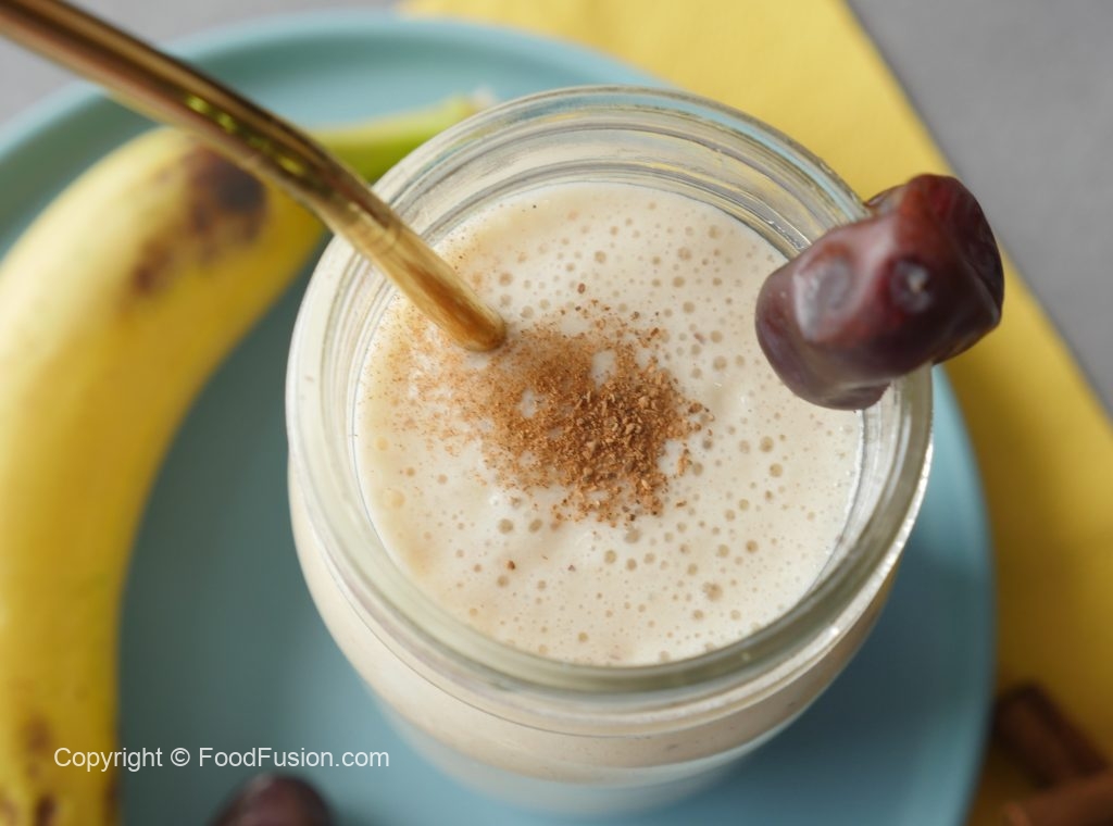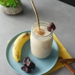 In blender jar,add dates (deseeded),banana,yogurt,milk,cinnamon powder,ice cubes and blend until well combined.