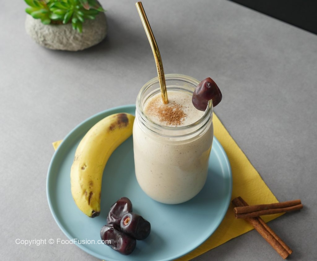 Blender jar mein khajure (deseeded),banana,dahi,doodh,darchini powder aur ice cubes dal ker ache tarhan blend ker lein.