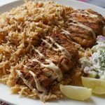 On serving plate,add cooked rice,chicken piece,salad and drizzle prepared sauce & serve!