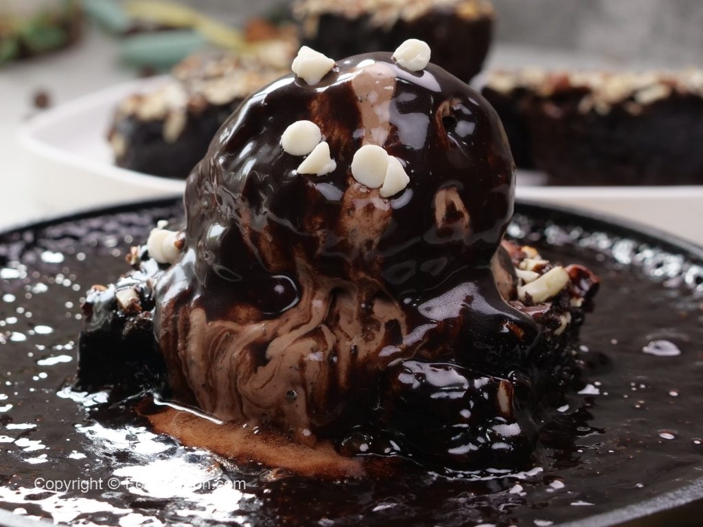 -Heat sizzler pan,place brownie,belgian chocolate ice cream & pour prepared chcoolate sauce.