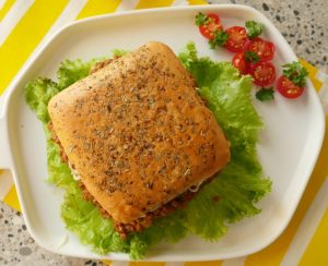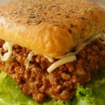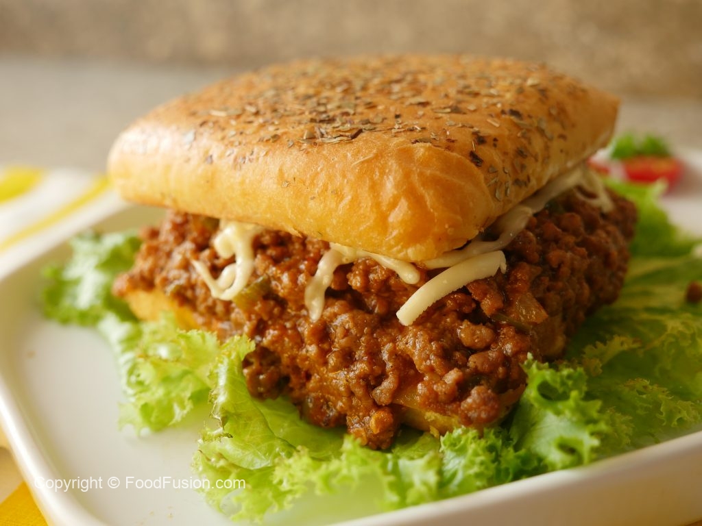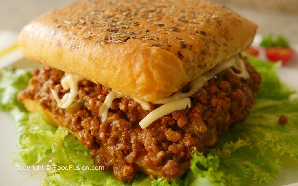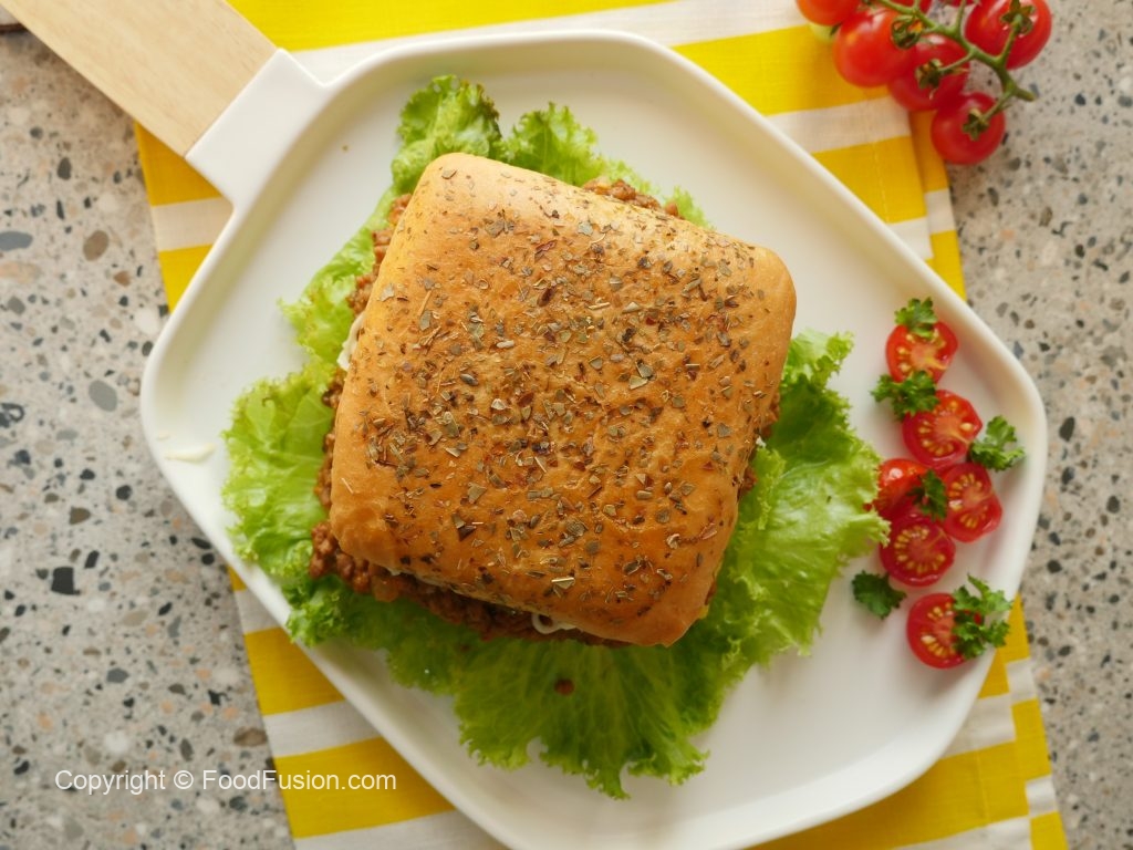 Add cheddar cheese,cooked beef filling,mozzarella cheese and top with another bun (makes 3-4).