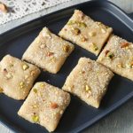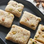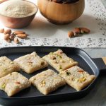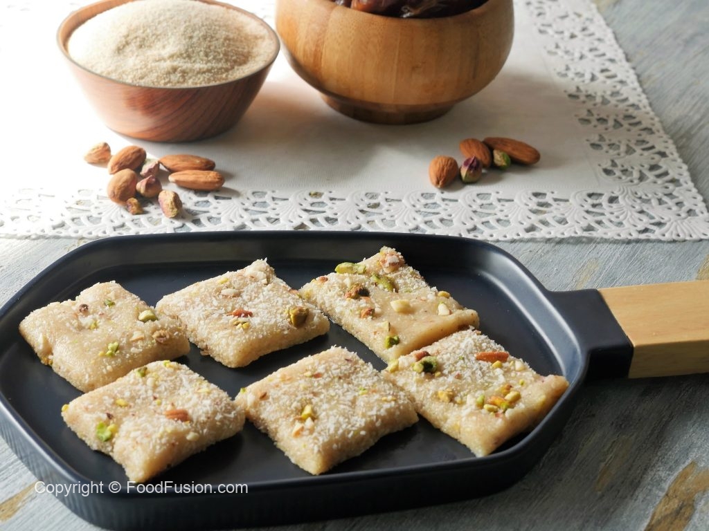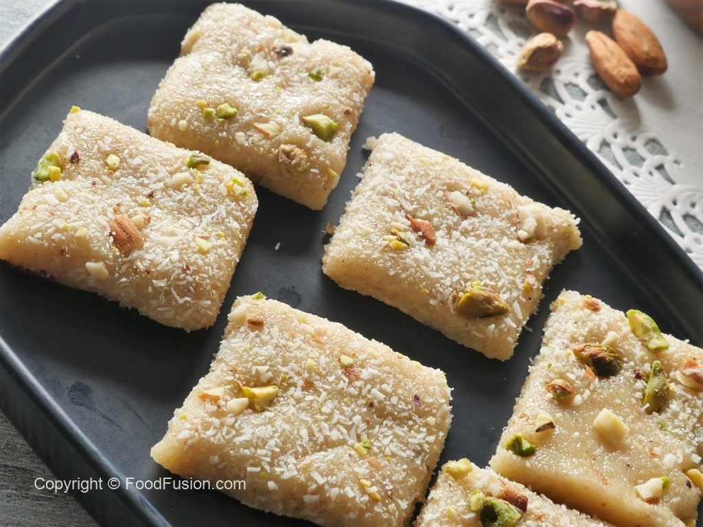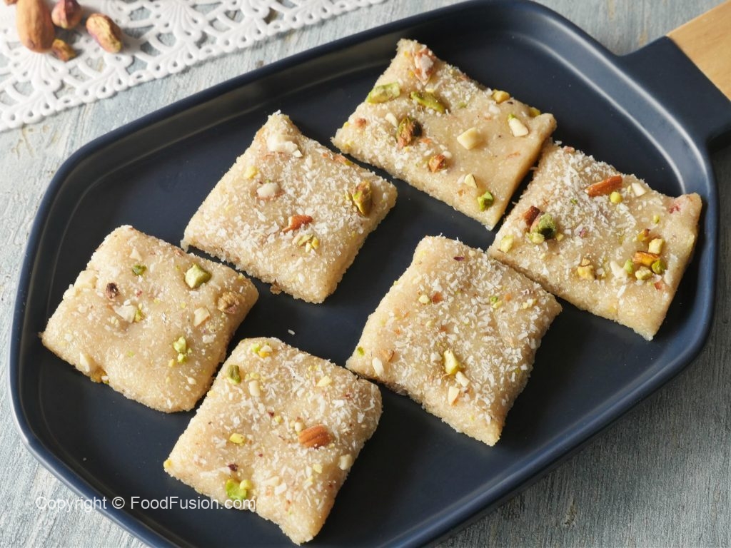 Ab isko greased tray main set karlen aur 1 hour rest kar len phir uper khopra, pista aur badaam sprinkle karke squares cut kar len.