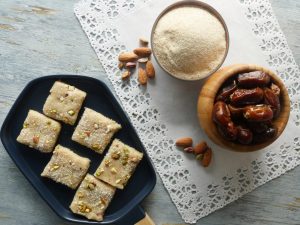 Sprinkle desiccated coconut, pistachio and almonds and cut in squares.