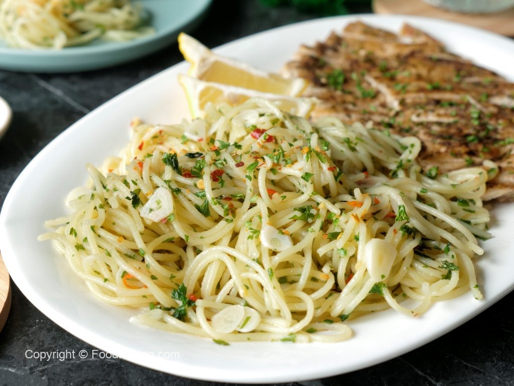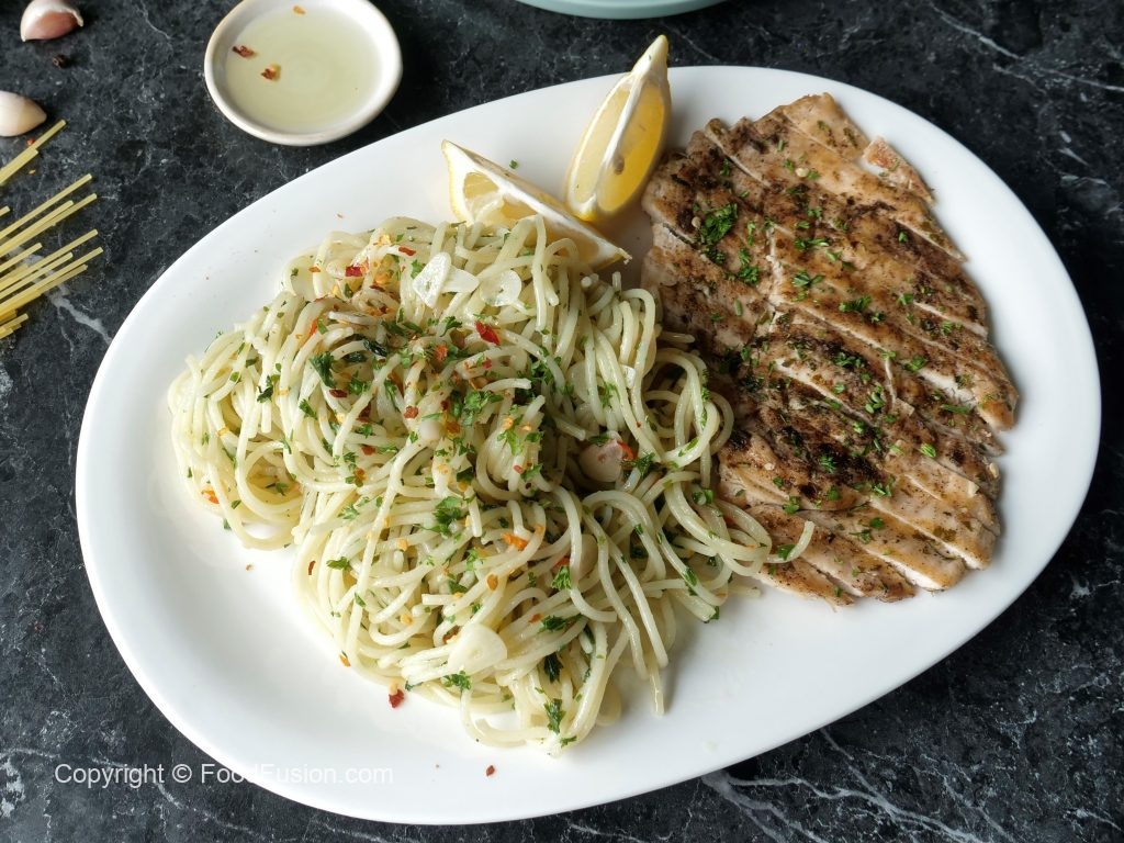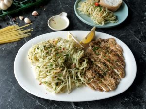 Sprinkle fresh parsley & red chilli crushed & serve spaghetti with grilled chicken & 7up.