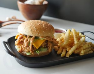 On burger bun,add mayonnaise,iceberg,crispy fried chicken piece,cheese slice,iceberg,jalapenos, prepared burger sauce and top with another bun.
