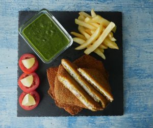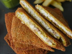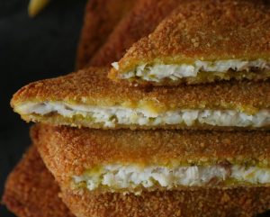 Now coat marinated fish fillets into breadcrumbs then dip into beaten eggs and again coat in breadcrumbs and shape into square shape.