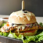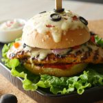On burger bun,add & spread pizza sauce,place cooked chicken fillet,cheddar cheese,mozzarella cheese, onion,capsicum,tomato,jalapenos,black olives,dried oregano and red chili crushed.