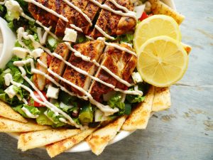 -In a serving platter,add garlic rice,spicy chicken roast ,fried garlic,fresh parsley,onion rings,roasted veggies & serve!
