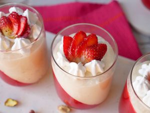 In serving glass,add prepared pistachio kheer enough to cover strawberry jelly and garnish with whipped cream & strawberry slices.