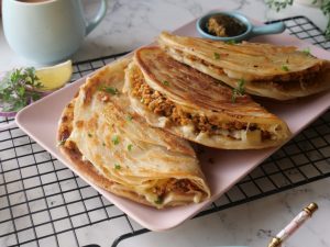 -Spread prepared chicken filling on one side, add mozzarella cheese & flip the other side of paratha over it. Press gently & cook from both sides until golden & crispy (makes 10).