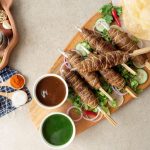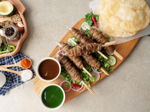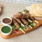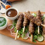 Haath geelay karein aur 75g mixture la ker wooden aur metal skewer per laga lein aur kitchen twine/thread sa bhand lein (makes 10-12).