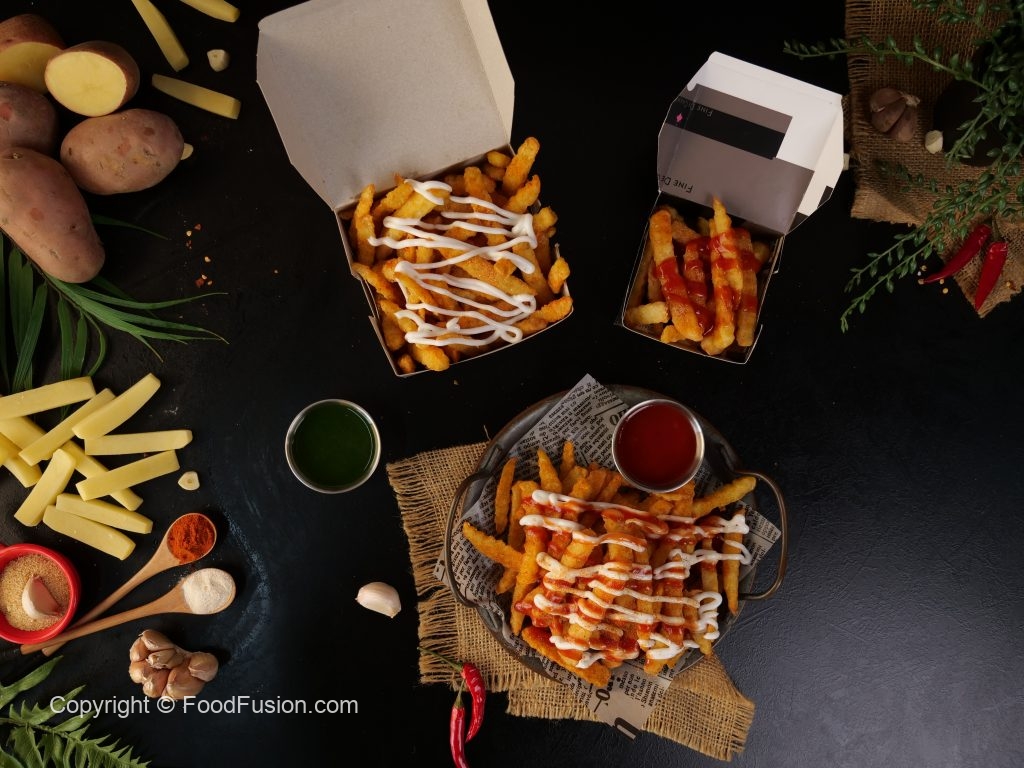 -In a wok,heat cooking oil & fry potato fries on medium low flame for 5 minutes then takeout & let it rest for 10 minutes,repeat frying process & fry on medium low flame until golden & crispy.