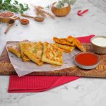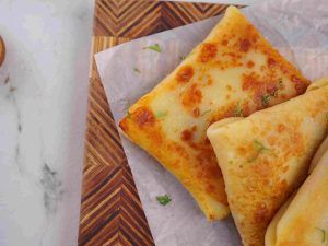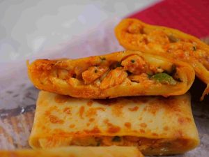 -Place 1 crepe on the cutting board, add cheddar & Mozzarella cheese, prepared chicken filling, more cheese, apply slurry, fold the corners, stuff filling inside & seal it properly.
