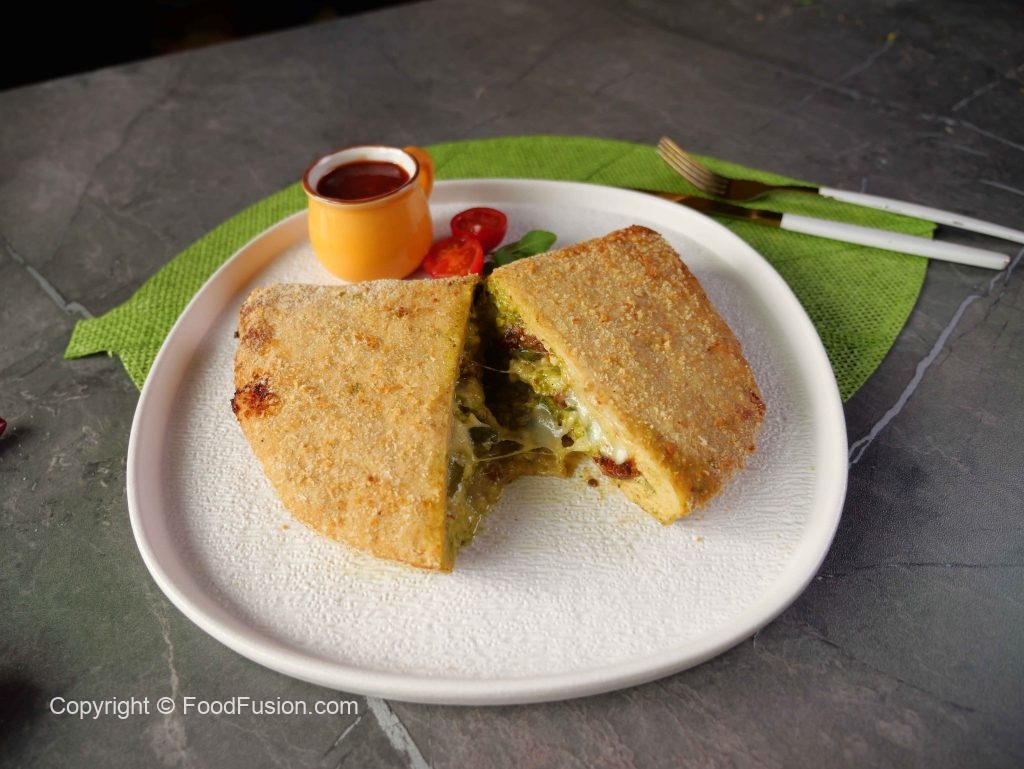 -Add prepared pesto & spread on half side,add mozzarella cheese,baby spinach,sun-dried tomatoes, fold,seal properly & coat with breadcrumbs.