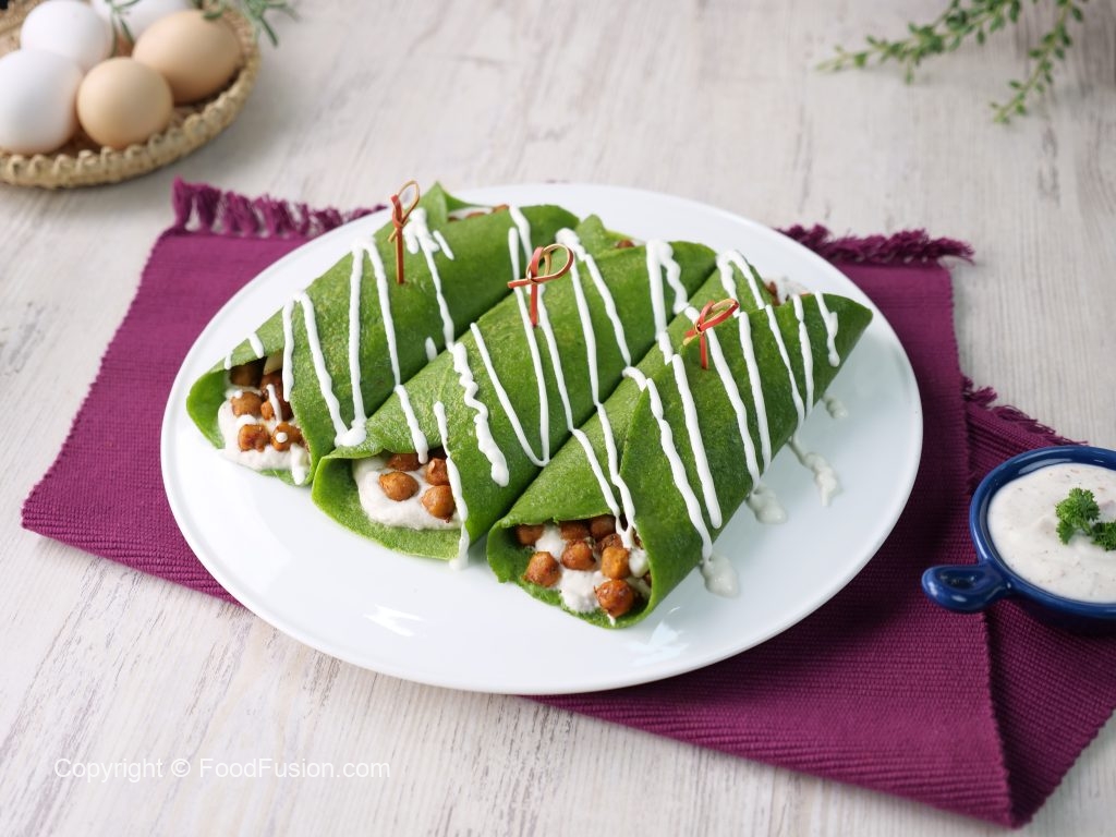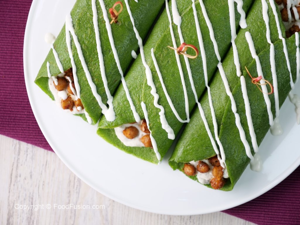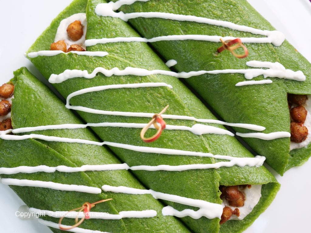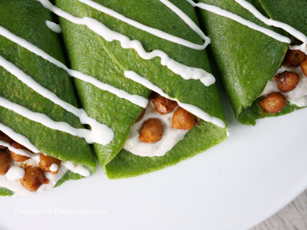-On a crepe,add & spread prepared yogurt sauce,prepared spiced (masala) chickpea & fold the crepe.