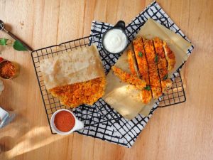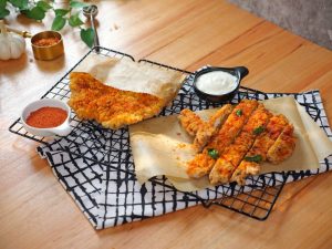 -Place the chicken fillet on a cutting board, slice from the side, open it, and flatten to make a butterfly shape.