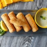 Dip bread roll ups into beaten eggs then coat in breadcrumbs.