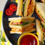 -On three bread slices,add prepared sauce,tandoori chicken pieces,cheese slice,flip one bread slice,add prepared sauce,salad leaves,onion,tomato,cucumber,cooked egg & flip bread slice to make a sandwich (makes 5).