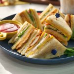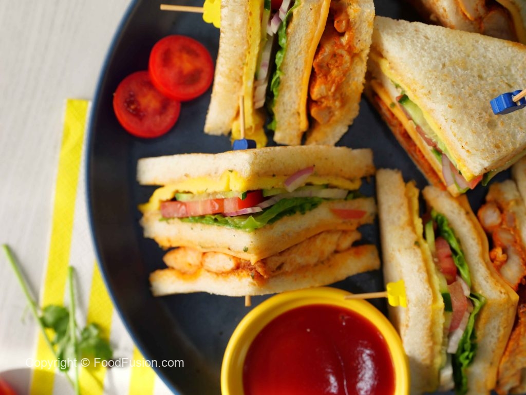 -Three bread slices per tayyar sauce,tandoori chicken pieces aur cheese slice dal ker flip ker lein phir tayyar sauce,salad patta,pyaz,tamatar,kheera aur cooked anda dal dein aur bread slice ko flip ker ka sandwich bana lein.