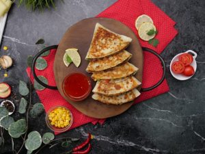 -Grease frying pan with cooking oil & cook stuffed tortillas from both sides until golden brown & apply oil in between (makes 12 triangles quesadillas).