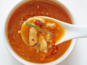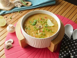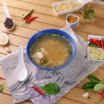 -Add lemon grass,ginger,onion,kaffir lime leaves,fresh coriander,pink salt,sugar,soy sauce,lemon juice,fish sauce,thai red chillies,chicken stock cube,cover partially & simmer cook on low flame for 25-30 minutes.