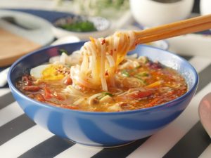 -Take out chicken pieces,shred the chicken from bones & cut fillet into thin pieces then strain the soup & set aside.
