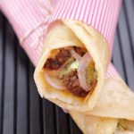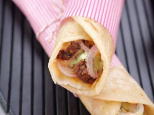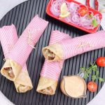 -Paratha per mayo sauce,cooked beef cubes,pyaz rings,hari chutney aur mayo sauce dal ker butter paper mein warp ker ka serve karein (makes 4-5).