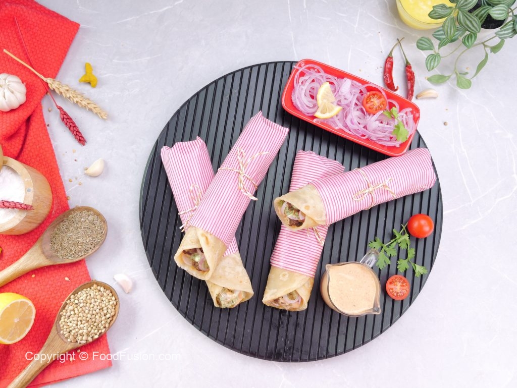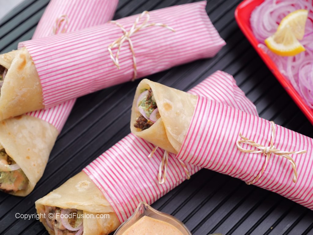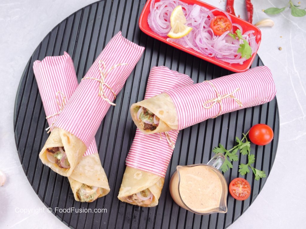 -On a paratha,spread mayo sauce,cooked beef cubes,onion rings,green chutney,mayo sauce,warp in butter paper & serve (makes 4-5).