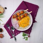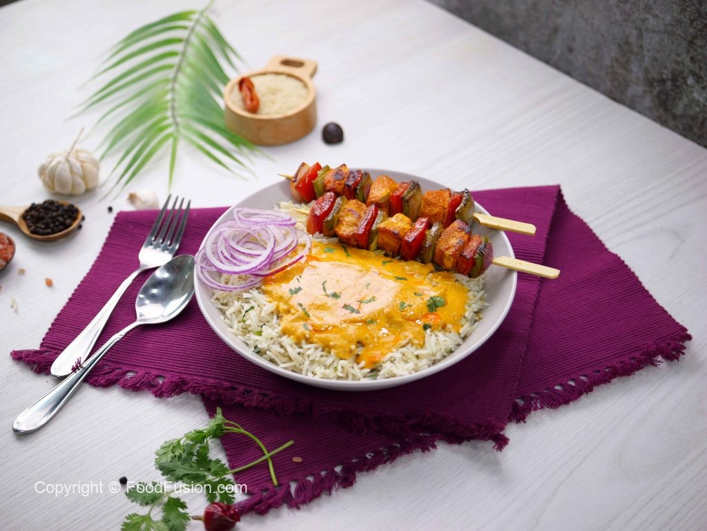 -In a serving bowl,add prepared rice,chicken tikka sticks,prepared creamy BBQ sauce,onion rings,fresh coriander & serve!