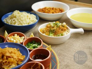 -In a jar, add gram flour, rice flour, orange food color, carom seeds, coriander, red chilli powder, pink salt, cumin, turmeric powder, red chilli crushed, baking soda, cover & shake well. Set aside.