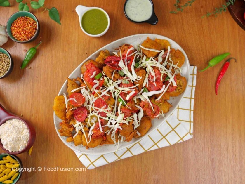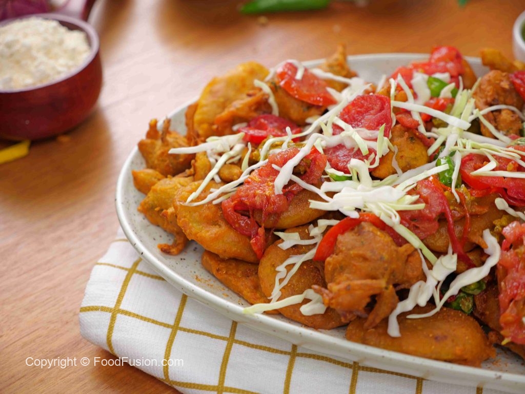 -In a serving platter, add fried pakoray, fried tomato & green chilli slices, pickle, garnish with cabbage & serve!