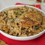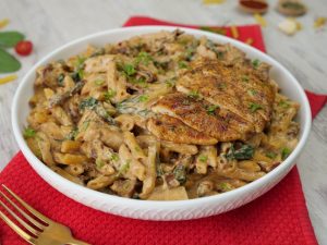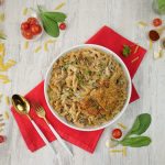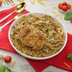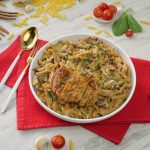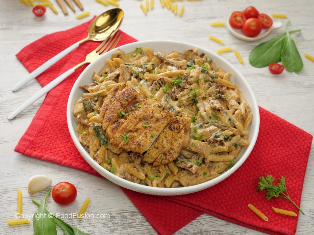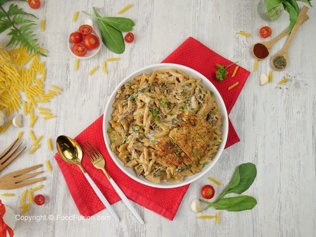 -Serving plate mein pasta aur cooked chicken slices dal dein aur fresh parsley garnish ker ka serve karein!