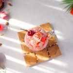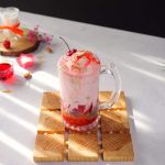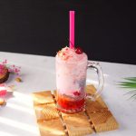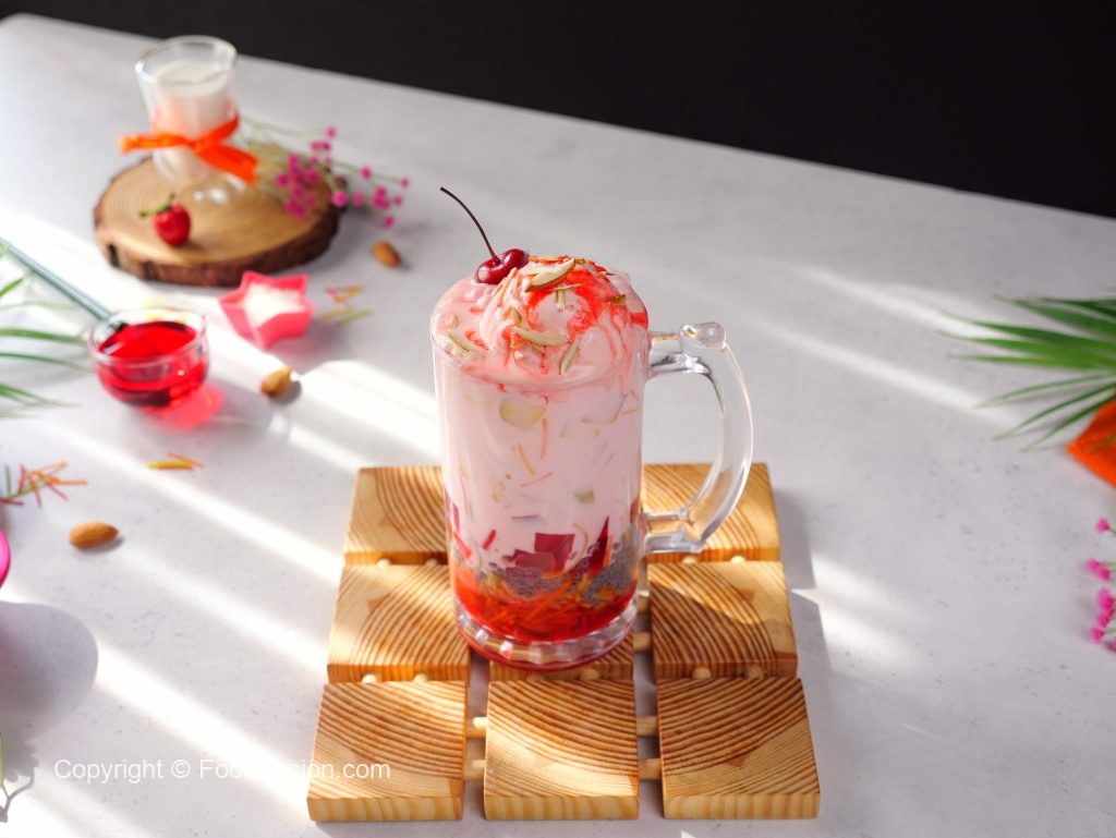 -In a serving glass add rose syrup, colourful vermicelli, soaked basil seeds, tutti frutti frozen dessert, prepared red jelly, apple, sapodilla, almonds, prepared rabri milk mixture, tutti frutti frozen dessert, garnish with rose syrup, almond, cherry & serve!