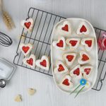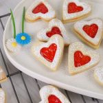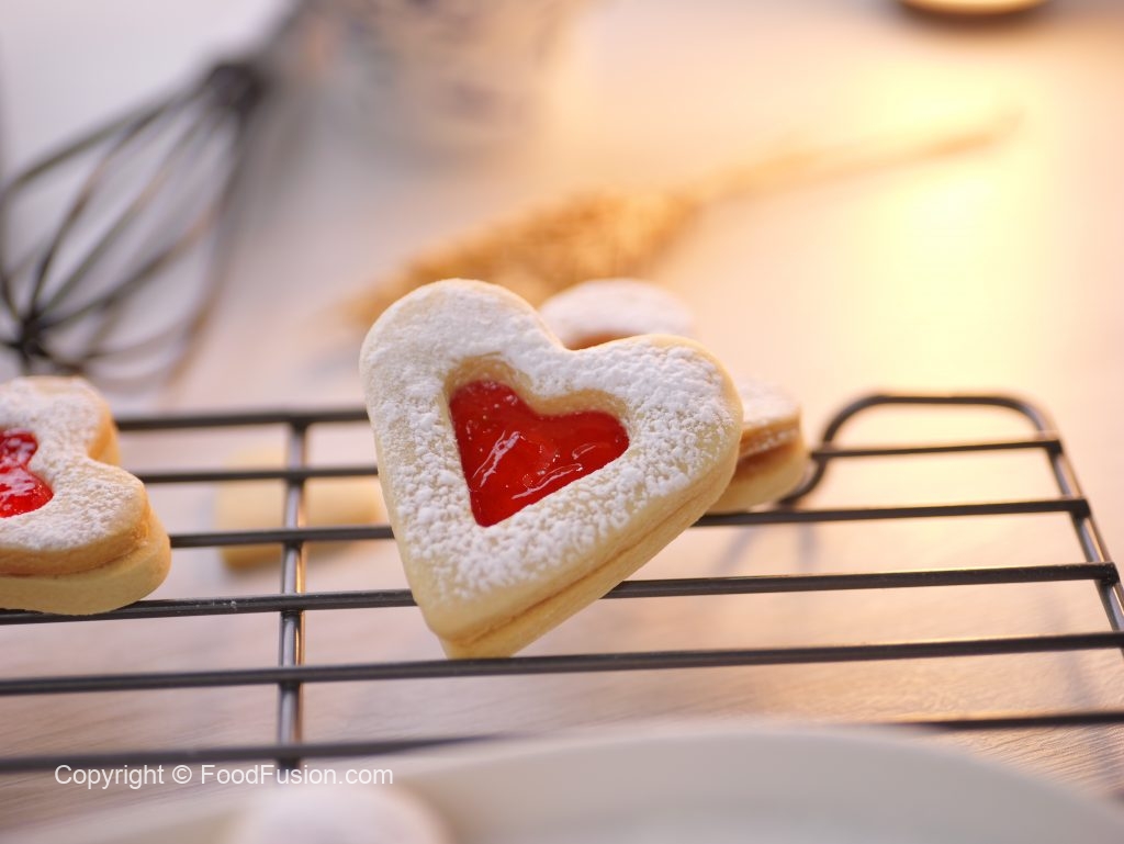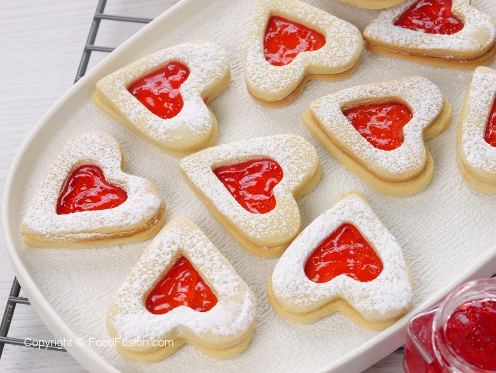-On whole heart cookies,add fruit jam in the center & top with cutout heart cookies (makes 25-26).