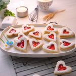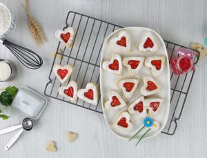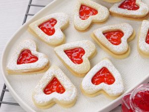 -Sprinkle icing sugar on hollow heart cookies.