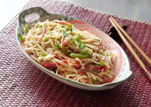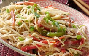 Boiled spaghetti,safed mirch powder,kali mirch crushed,nama,chicen powder,soy sauce,hot sauce aur sirka dal ker 1-2 minutes kliya ache tarhan mix ker lein.