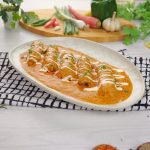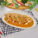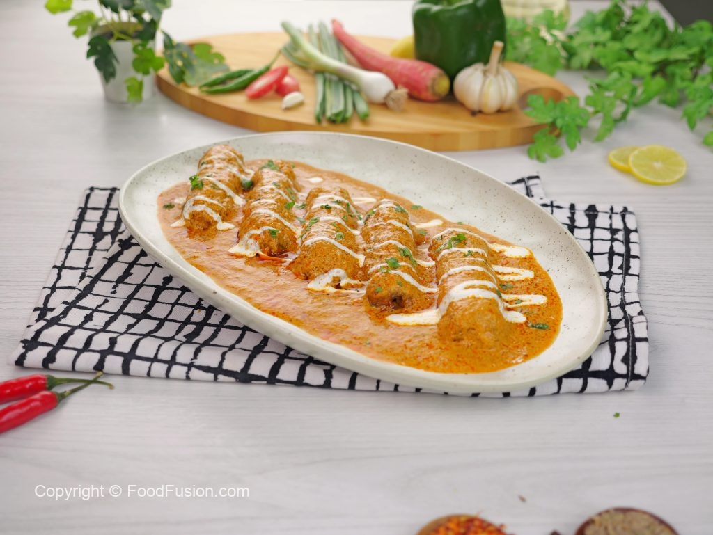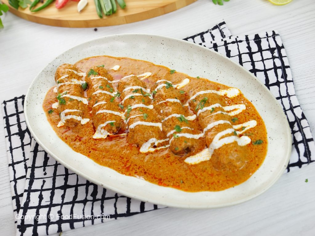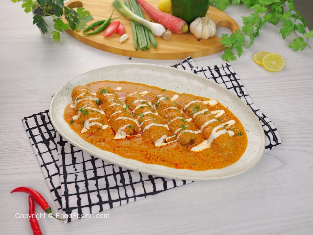 -In a serving platter add vegetable seekh kabab, pour gravy over kabab, garnish with cream & fresh coriander, serve with naan!