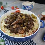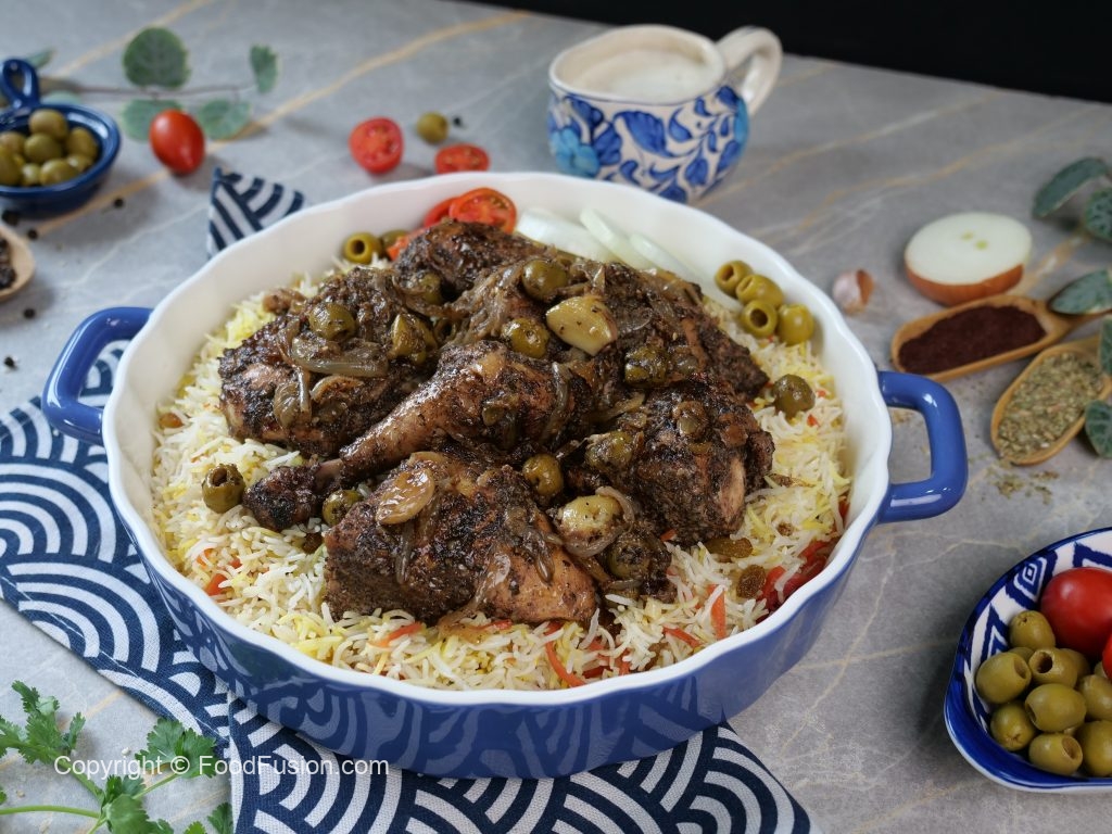 -Marinated chicken aur green olives dal ker dhak dein aur halki ancch per gul janay tak paka lein (30-35 minutes) aur bech bech mein sides ko change ker lein & side per rakh dein.